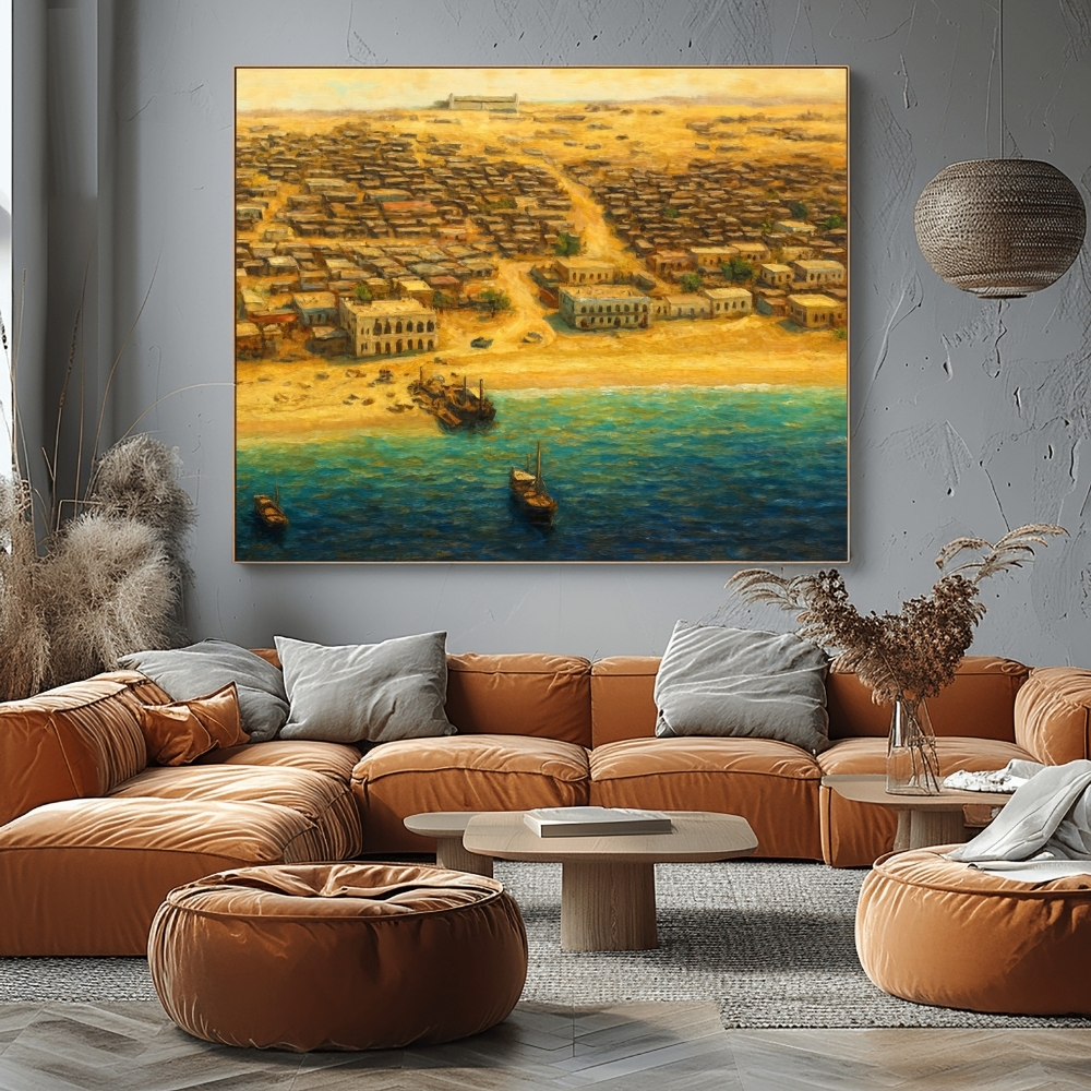 لوحة فنية رقمية عالية الجودة قابلة للطباعة (JPG 90×60 cm)، تُجسّد مشهدًا بانوراميًا من أبوظبي في منتصف القرن الماضي، بأسلوب digital restoration art و realistic digital painting مستوحى من الأرشيفات العامة. – عمل فني مستوحى من public historical archives التي وثّقت التحوّل العمراني المبكر لأبوظبي، أُعيد تخيّله بأسلوب digital realistic restoration art يحافظ على روح المكان ويمنحه عمقًا بصريًا معاصرًا. – يُظهر المشهد امتداد المدينة من الشاطئ نحو الداخل، ببيوت تقليدية منخفضة، طرق ترابية، ومبانٍ حجرية بسيطة، مع مراكب خشبية راسية قرب الساحل، في تصوير صادق للعلاقة العضوية بين البحر والعمران. – تتدرّج الكتل المعمارية صعودًا نحو الصحراء، لتكشف مرحلة انتقالية جمعت بين Emirati coastal heritage وبدايات النسيج الحضري المنظّم في أبوظبي. – زاوية الرؤية الواسعة والإضاءة الذهبية تمنح اللوحة طابع cinematic coastal cityscape، بينما تضيف ضربات الفرشاة الرقمية إحساس oil-inspired digital painting يضفي هدوءًا وتأملًا زمنيًا. – تحتوي هذه اللوحة على لمسات فنية طفيفة من digital revival ناتجة عن عمليات AI-assisted restoration و digital painting، مثل اختلافات بسيطة في بعض تفاصيل المباني أو القوارب، إضافة إلى ضربات فرشاة رقمية واضحة في البحر والسماء. هذه اللمسات جزء من الأسلوب الفني ولا تؤثر على الجو العام أو صدقيته التاريخية، بل تعزّز إحساس hand-painted digital realism وتحافظ على روح المشهد وأصالته. – مناسبة لتزيين المكاتب، المجالس، الديوانيات، المنازل، صالات الاستقبال، والمعارض الفنية، حيث تضيف طابعًا من Abu Dhabi vintage coastal wall art وتستحضر ذاكرة المدينة في مرحلة مفصلية من تاريخها. المقاسات القابلة للطباعة | Available Print Sizes يمكن طباعة هذه اللوحة الفنية الرقمية بمقاسات متعددة لتناسب مختلف المساحات والاستخدامات الفنية: – المقاسات الأساسية: 90 × 60 cm 70 × 50 cm 60 × 40 cm 45 × 30 cm – مقاسات قياسية إضافية: A1 – A2 – A3 – A4يمكن أيضًا طباعة العمل بمقاسات أكبر من المذكورة أعلاه عند الطلب، مع انخفاض طفيف جدًا في الجودة لا يُلاحظ بالعين المجردة ولا يؤثر على القيمة الجمالية أو التجربة البصرية. تنبيه | Note: هذا المنتج رقمي فقط، وستستلم ملفًا رقميًا عالي الجودة، ولن يتم شحن أي منتج ملموس. Digital product only – No physical item will be shipped.