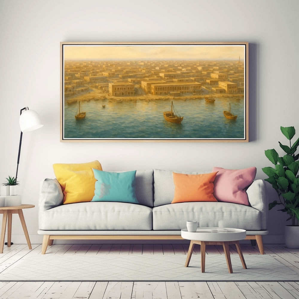 لوحة فنية رقمية عالية الجودة قابلة للطباعة (JPG 90×60 cm) تُقدّم مشهدًا بانوراميًا لمدينة الدوحة قديمًا من منظور مرتفع يطل على الساحل والمرافئ، بأسلوب digital realistic restoration art مستوحى من الأرشيفات العامة التي وثّقت البدايات العمرانية للمدينة الساحلية. • عمل فني مستلهم من الصور التاريخية النادرة لواجهة الدوحة البحرية، أُعيد تخيّله بأسلوب realistic digital painting يغمره ضوء ذهبي دافئ يعكس أجواء الخليج في حقبة ما قبل الطفرة الحديثة. • تتراص المباني التقليدية ذات الأسطح المستوية والأقواس البسيطة على امتداد الساحل، مشكلة نسيجًا عمرانيًا متجانسًا يعكس روح العمارة القطرية القديمة. • في المقدمة، ترسو قوارب الصيد الخشبية بهدوء فوق صفحة الماء المتلألئة، بينما يتحرك الأهالي بمحاذاة الشاطئ في مشهد إنساني يوحي ببساطة الحياة اليومية وارتباط المجتمع بالبحر كمصدر رزق وهوية. • الامتداد البصري الواسع يمنح اللوحة إحساسًا بالعمق والسكينة، ويُبرز العلاقة العضوية بين المدينة والبحر في تكوين بانورامي غني بالتفاصيل التراثية. تمت إعادة إحياء هذا المشهد عبر تقنيات الترميم والإنتاج الرقمي بالذكاء الاصطناعي، وقد تظهر لمسات فنية طفيفة أو اختلافات بسيطة في بعض التفاصيل الدقيقة مثل ملامح الأشخاص أو حواف العناصر المعمارية، وهي نتيجة طبيعية لعمليات الإحياء الرقمي. هذه السمات تُعد جزءًا من الطابع الفني للعمل وتمنحه هوية digital restoration painting معاصرة، دون أن تؤثر على الجوهر التاريخي أو مصداقية المشهد العام. فاللوحة تحافظ على روح الدوحة القديمة وتنقلها بإحساس بصري صادق ومُلهم. • مثالية لتزيين المكاتب، المجالس، الديوانيات، المنازل، والمعارض الفنية، حيث تضيف طابعًا تراثيًا قطريًا يعكس تاريخ الساحل والعمارة التقليدية في الدوحة القديمة. • تتوفر للطباعة بمقاسات 90×60، 70×50، 60×40، 45×30 بالإضافة إلى A1–A4، كما يمكن طباعتها بمقاسات أكبر عند الطلب مع انخفاض طفيف جدًا في الجودة قد لا يكون ملحوظًا بصريًا. تنبيه: هذا منتج رقمي فقط، ستستلم ملفًا رقميًا عالي الجودة ولن يتم شحن أي منتج ملموس. Note: This is a digital product only. You will receive a high-resolution digital file. No physical item will be shipped.