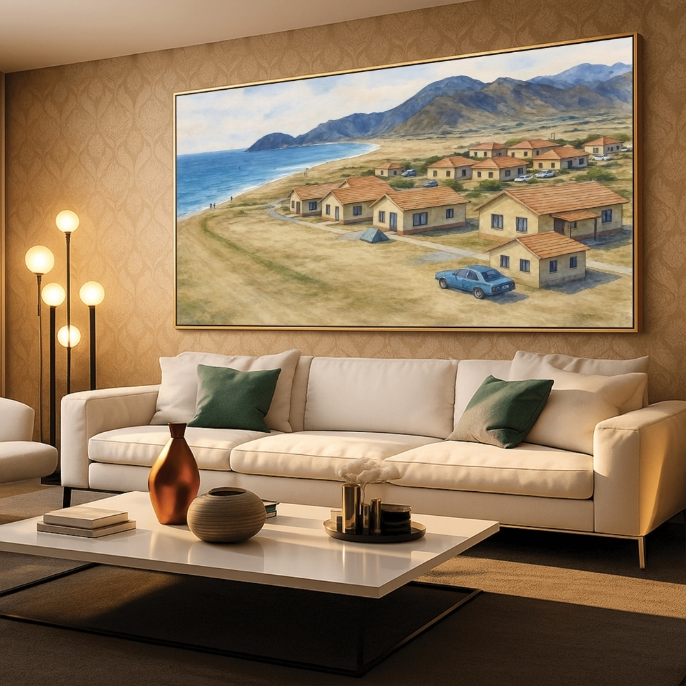 لوحة فنية رقمية عالية الجودة قابلة للطباعة (JPG 90×60 cm)، تُجسّد مشهدًا نادرًا من منتجع ساحلي في منطقة دبا بإمارة الفجيرة خلال السبعينات، بأسلوب digital restoration art و realistic digital painting مستوحى من الأرشيفات العامة. – عمل فني مستوحى من public historical archives التي وثّقت البدايات الأولى للنشاط السياحي والإقامة الساحلية في دبا، أُعيد تخيّله بأسلوب digital realistic restoration art يجمع بين التوثيق البصري والطابع الفني الهادئ. – يُظهر المشهد وحدات سكنية بسيطة مصطفّة قرب الشاطئ، بعمارة منخفضة وأسقف مائلة، تحيط بها المساحات الرملية المفتوحة، في تعبير صادق عن مفهوم المنتجعات المبكرة في الإمارات قبل الطفرة السياحية الحديثة. – في الخلفية، تتعانق الجبال مع البحر في تكوين طبيعي مهيب، ليجسّد العلاقة الفريدة بين Fujairah coastal landscape و Hajar mountain scenery، وهي سِمة أساسية لهوية دبا الجغرافية. – وجود السيارات الكلاسيكية والممرات الترابية يعكس روح السبعينات، بينما تمنح الإضاءة الطبيعية المشهد طابع cinematic coastal retreat scene بأسلوب قريب من oil-inspired digital painting يوحي بالسكينة والبساطة. فقرة الإحياء الرقمي (Digital Revival Transparency) – تحتوي هذه اللوحة على لمسات فنية طفيفة من digital revival ناتجة عن عمليات AI-assisted restoration و digital painting، مثل اختلافات بسيطة في بعض تفاصيل المباني أو العناصر المحيطة، إضافة إلى ضربات فرشاة رقمية واضحة في السماء والجبال والرمال. هذه اللمسات تُعد جزءًا من الأسلوب الفني للعمل ولا تؤثر على الجو العام أو صدقيته التاريخية، بل تعزّز إحساس hand-painted digital realism وتحافظ على روح المكان والزمن. – مناسبة لتزيين المكاتب، المجالس، الديوانيات، المنازل، صالات الاستقبال، والمنتجعات السياحية والمعارض الفنية، حيث تضيف طابعًا من Dibba Fujairah vintage coastal wall art وتستحضر ذاكرة البدايات الهادئة للسياحة الساحلية في المنطقة الشرقية. المقاسات القابلة للطباعة | Available Print Sizes يمكن طباعة هذه اللوحة الفنية الرقمية بمقاسات متعددة لتناسب مختلف المساحات والاستخدامات الفنية: – المقاسات الأساسية: 90 × 60 cm 70 × 50 cm 60 × 40 cm 45 × 30 cm – مقاسات قياسية إضافية: A1 – A2 – A3 – A4يمكن أيضًا طباعة العمل بمقاسات أكبر من المذكورة أعلاه عند الطلب، مع انخفاض طفيف جدًا في الجودة لا يُلاحظ بالعين المجردة ولا يؤثر على القيمة الجمالية أو التجربة البصرية. تنبيه | Note: هذا المنتج رقمي فقط، وستستلم ملفًا رقميًا عالي الجودة، ولن يتم شحن أي منتج ملموس. Digital product only – No physical item will be shipped.