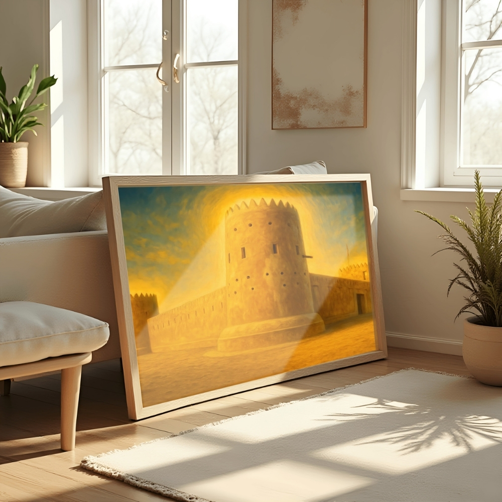 لوحة فنية رقمية عالية الجودة قابلة للطباعة (JPG 90×60 cm) تُجسّد حصنًا قطريًا شامخًا ينهض من قلب الصحراء، بأسلوب digital realistic restoration art مستوحى من الأرشيفات العامة التي وثّقت الحصون التقليدية في قطر بروحها الدفاعية الأصيلة. • عمل فني مستلهم من صور أرشيفية عامة لحصون قطر التاريخية، أُعيد تخيّله بأسلوب realistic digital painting يغلب عليه التوهج الذهبي الذي يعكس دفء الشمس القطرية فوق الجدران الطينية. • يبرز البرج الأسطواني في مقدمة المشهد كتاج معماري تعلوه الشرفات المسننة، مع فتحات مراقبة صغيرة تروي قصة الحراسة والصمود في وجه تقلبات الزمن. • تمتد الجدران السميكة بخطوط أفقية هادئة تعكس بساطة العمارة الدفاعية التقليدية، بينما تضفي الخلفية المتدرجة بين الأزرق والذهبي عمقًا بصريًا يرمز إلى تلاقي السماء بالصحراء. • المشهد بأكمله يغمره ضوء دافئ أشبه بهالة تحيط بالحصن، في إيحاء رمزي لشموخ قطر وقوة جذورها التاريخية. تمت إعادة إحياء هذا العمل باستخدام تقنيات الذكاء الاصطناعي والترميم الرقمي، مع الحفاظ على الطابع المعماري الأصيل للحصن. قد تظهر بعض اللمسات الفنية الطفيفة الناتجة عن الإحياء الرقمي، مثل نعومة متفاوتة في بعض الأسطح أو اختلافات دقيقة في تفاصيل الفتحات والزوايا أو تأثيرات فرشاة رقمية واضحة في مناطق الإضاءة المكثفة. هذه السمات طبيعية في أعمال restoration art digital painting، ولا تمس صدقية المشهد أو قيمته التراثية، بل تعكس عملية إعادة التخيل الفني وتمنح اللوحة طابعًا بصريًا معاصرًا بشفافية ومصداقية عالية. • مثالية لتزيين المجالس القطرية، الديوانيات، المكاتب الرسمية، المنازل، وصالات العرض الفنية، حيث تضيف حضورًا مهيبًا يعكس الهوية الوطنية وعمق التراث المعماري القطري. • متوفرة للطباعة بالمقاسات التالية: 90×60، 70×50، 60×40، 45×30 بالإضافة إلى A1–A4 لتناسب مختلف المساحات. ويمكن طباعتها بمقاسات أكبر عند الطلب مع انخفاض طفيف جدًا في الجودة غير ملحوظ غالبًا عند العرض الجداري. تنبيه / Note تنبيه: هذا المنتج رقمي فقط، ستستلم ملفًا رقميًا عالي الجودة ولن يتم شحن أي منتج ملموس. Note: This is a digital product only. You will receive a high-resolution digital file. No physical item will be shipped.