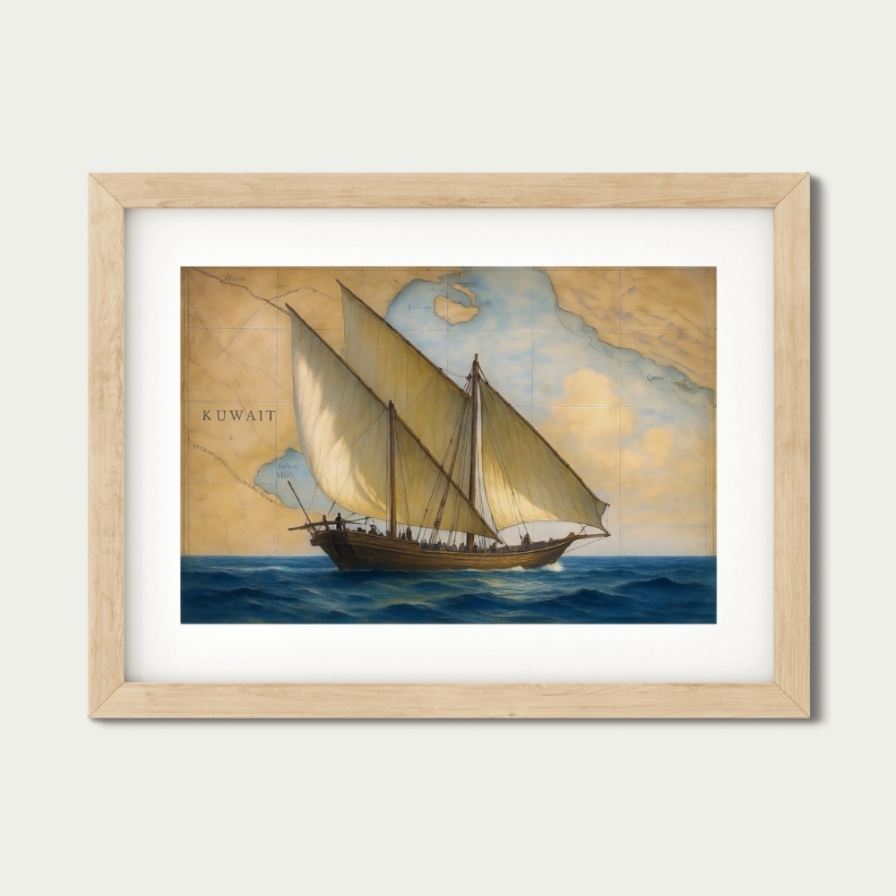 لوحة فنية رقمية قابلة للطباعة (JPG ‎90×60 cm) تُجسّد سفينة traditional Kuwaiti dhow وهي تبحر فوق خلفية مستوحاة من historical maritime maps of Kuwait and the Arabian Gulf، في مشهد رمزي يجمع بين navigation history, trade routes, وArab seafaring legacy الذي شكّل هوية الكويت البحرية عبر العصور. العمل منفذ بأسلوب digital oil painting illustration مع معالجة لونية دافئة تُبرز تباين البحر مع الخريطة القديمة، وتُحاكي روح vintage nautical charts, classic maritime art, وGulf exploration era, حيث تتحول الخريطة إلى مسرح بصري يربط السفينة بالزمان والمكان معًا. اللوحة مستوحاة من الأرشيفات العامة والخرائط التاريخية، وتحتوي على لمسات إحياء رقمي وضربات فرشاة رقمية ناتجة عن AI-assisted artistic rendering. قد تظهر اختلافات فنية طفيفة أو تبسيط مقصود في تفاصيل الأشرعة، الخطوط الجغرافية، أو ملامح الطاقم البعيد، وهي معالجة فنية تهدف إلى تعزيز الإحساس الرمزي والبعد التاريخي، لا التوثيق الجغرافي الدقيق. مثالية لعشّاق Kuwait maritime history, dhow sailing wall art, heritage map artwork, وMiddle Eastern nautical decor، وتناسب الديوانيات، المكاتب، المجالس، والمساحات الثقافية ذات الطابع البحري والتراثي. المقاسات المتاحة للطباعة: 90×60 سم – 70×50 سم – 60×40 سم – 45×30 سم – بالإضافة إلى مقاسات A1–A4. تنبيه: هذا منتج رقمي فقط – لا يتم شحن أي نسخة مطبوعة. Note: Digital product only – no physical item will be shipped.