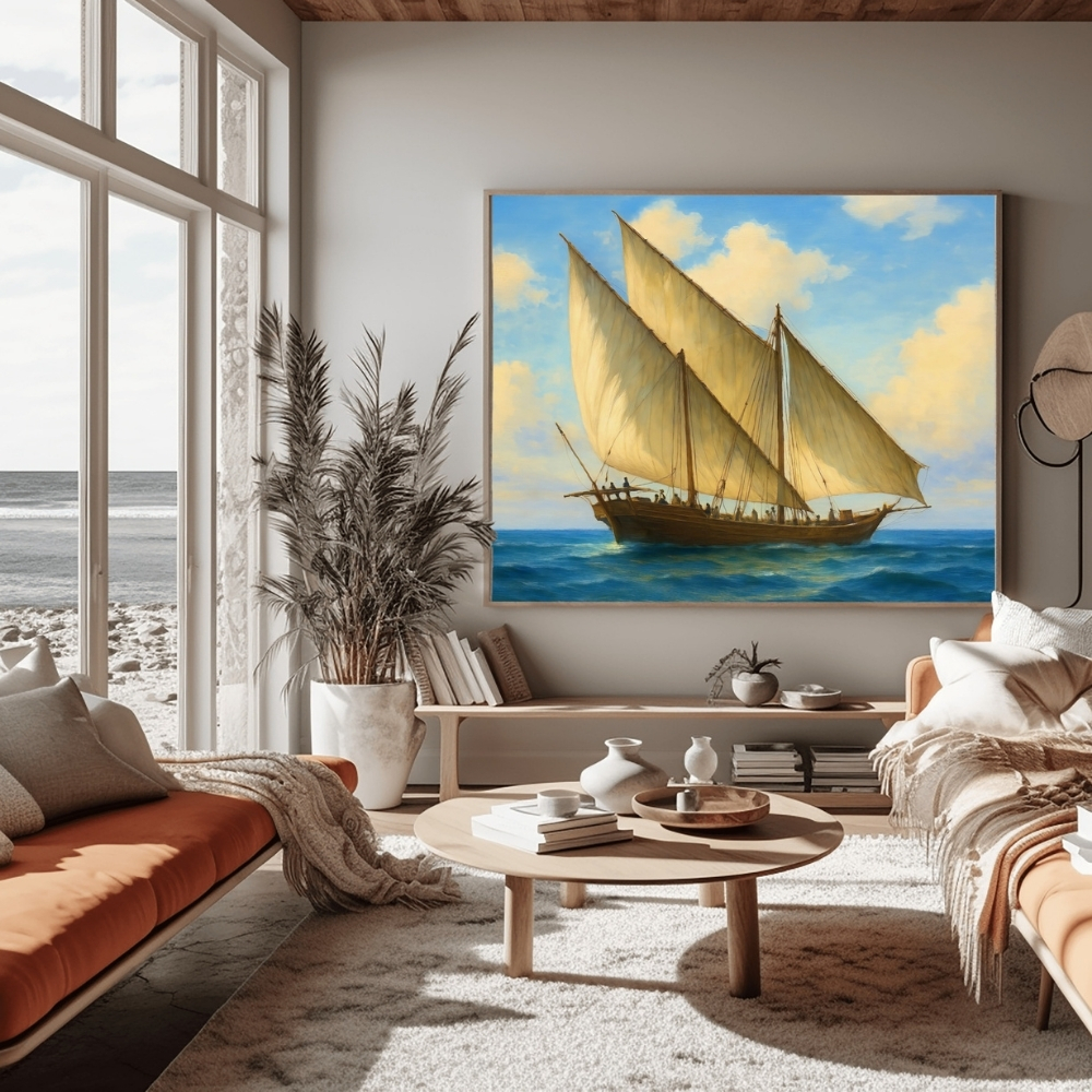 لوحة فنية رقمية قابلة للطباعة (JPG 90×60 cm) تُجسّد traditional Kuwaiti dhow وهي تشق مياه الخليج بهدوء، بأشرعة قطنية مرفوعة تعكس wind-driven sailing, Arab maritime tradition, وملامح pre-oil era seafaring culture في الكويت. العمل مصاغ بأسلوب digital oil painting مع معالجة ضوئية ناعمة تُبرز حركة البحر، توازن السفينة، وانسيابية الأشرعة، ضمن أجواء classic nautical art, Gulf seascape, وMiddle Eastern maritime heritage المستوحاة من رحلات التجارة، الغوص، والأسفار البحرية الطويلة. اللوحة مستوحاة من الأرشيفات العامة والخيال الفني البحري، وتحتوي على لمسات إحياء رقمي وضربات فرشاة رقمية ناتجة عن AI-assisted artistic rendering. قد تظهر اختلافات طفيفة أو تبسيط فني في تفاصيل الحبال، أطراف الأشرعة، أو ملامح الطاقم البعيدة، وهي معالجة مقصودة للحفاظ على الإحساس الحركي والروح الزمنية للمشهد، دون السعي لمحاكاة فوتوغرافية دقيقة. مثالية لعشّاق Kuwait maritime history, dhow sailing art, heritage wall art, وتناسب المجالس، الديوانيات، المكاتب، والمساحات ذات الطابع البحري والثقافي. المقاسات المتاحة للطباعة: 90×60 سم – 70×50 سم – 60×40 سم – 45×30 سم – بالإضافة إلى مقاسات A1–A4. تنبيه: هذا منتج رقمي فقط – لا يتم شحن أي نسخة مطبوعة. Note: Digital product only – no physical item will be shipped.