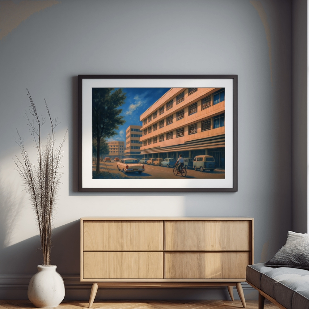 لوحة فنية رقمية قابلة للطباعة (JPG 90×60 cm) تُجسّد مشهدًا حضريًا من Fahad Al-Salem Street في قلب مدينة الكويت خلال the 1960s modern transformation era، حيث تتجلّى ملامح early modern architecture, الشرفات الخرسانية المتتابعة، والنوافذ ذات الشبكات الهندسية التي شكّلت هوية العمران الكويتي في بدايات الدولة الحديثة. يعكس العمل حركة الشارع اليومية عبر السيارات الكلاسيكية، الحافلات الصغيرة، والدراجات، في مشهد بصري يستحضر mid-century urban life, Kuwait city modernization, وpost-oil architectural growth, مع توازن دقيق بين الظل والضوء يمنح اللوحة إحساسًا سينمائيًا هادئًا يعكس نبض المدينة في تلك المرحلة. اللوحة مستوحاة من الأرشيفات العامة والصور التاريخية، وتحتوي على لمسات إحياء رقمي وضربات فرشاة رقمية ناتجة عن AI-assisted artistic rendering. قد تظهر اختلافات فنية طفيفة أو تبسيط مقصود في بعض الوجوه، تفاصيل المركبات، أو عناصر المشهد البعيد، وهي معالجة فنية واعية تهدف إلى تعزيز الجو العام والذاكرة البصرية للمكان، لا إلى التوثيق الفوتوغرافي الحرفي. مثالية لعشّاق Kuwait urban heritage, 1960s city street art, modern Gulf architecture, وhistorical Middle Eastern cityscapes، وتناسب الديوانيات، المكاتب، المجالس، والمساحات الثقافية ذات الطابع المعماري والتاريخي. المقاسات المتاحة للطباعة: 90×60 سم – 70×50 سم – 60×40 سم – 45×30 سم – بالإضافة إلى مقاسات A1–A4. تنبيه: هذا منتج رقمي فقط – لا يتم شحن أي نسخة مطبوعة. Note: Digital product only – no physical item will be shipped.