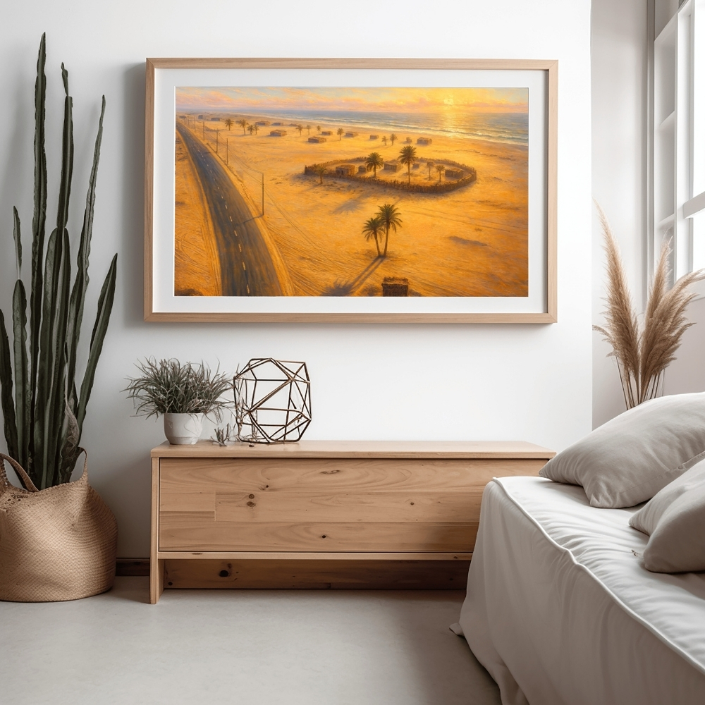 لوحة فنية رقمية عالية الجودة قابلة للطباعة (JPG 90×60 cm)، تُجسّد مشهدًا بانوراميًا من الجميرة التاريخية قبل التوسع العمراني، بأسلوب digital restoration art و realistic digital painting مستوحى من الأرشيفات العامة. – لوحة فنية مستوحاة من public historical archives التي وثّقت الحياة الساحلية في منطقة الجميرة قديمًا، أُعيد تخيّلها بأسلوب digital realistic restoration art يوازن بين التوثيق والبعد الفني. – يُظهر المشهد بيوتًا بسيطة متناثرة على امتداد الساحل، محاطة بالرمال وأشجار النخيل، مع طرق أولية تمتد بمحاذاة البحر، في تصوير صادق لبدايات الاستقرار الساحلي في دبي. – الإطلالة العلوية تكشف العلاقة المفتوحة بين الإنسان، الأرض، والبحر، حيث تتجلّى Emirati coastal heritage في أبسط صورها، بعيدًا عن الكثافة العمرانية الحديثة. – ضوء الغروب الذهبي وانعكاسه على الرمال والماء يمنح اللوحة طابع cinematic coastal desert scene، بأسلوب أقرب إلى oil-inspired digital painting يضفي إحساسًا بالهدوء والاتساع الزمني. – تحتوي هذه اللوحة على لمسات فنية طفيفة من digital revival ناتجة عن عمليات AI-assisted restoration و digital painting، مثل اختلافات بسيطة في بعض تفاصيل المباني أو توزيع العناصر الطبيعية، إضافة إلى ضربات فرشاة رقمية واضحة في السماء والرمال. هذه اللمسات تُعد جزءًا من الأسلوب الفني للعمل ولا تؤثر على الجو العام أو صدقيته التاريخية، بل تعزّز إحساس hand-painted digital realism وتُبقي المشهد نابضًا بروح الماضي. – مناسبة لتزيين المكاتب، المجالس، الديوانيات، المنازل، صالات الاستقبال، والمعارض الفنية، حيث تضيف طابعًا من Jumeirah Dubai vintage wall art وتستحضر ذاكرة الساحل والحياة البسيطة في الجميرة قبل التحولات الكبرى. المقاسات القابلة للطباعة | Available Print Sizes يمكن طباعة هذه اللوحة الفنية الرقمية بمقاسات متعددة لتناسب مختلف المساحات والاستخدامات الفنية: – المقاسات الأساسية: 90 × 60 cm 70 × 50 cm 60 × 40 cm 45 × 30 cm – مقاسات قياسية إضافية: A1 – A2 – A3 – A4يمكن أيضًا طباعة العمل بمقاسات أكبر من المذكورة أعلاه عند الطلب، مع انخفاض طفيف جدًا في الجودة لا يُلاحظ بالعين المجردة ولا يؤثر على القيمة الجمالية أو التجربة البصرية. تنبيه | Note: هذا المنتج رقمي فقط، وستستلم ملفًا رقميًا عالي الجودة، ولن يتم شحن أي منتج ملموس. Digital product only – No physical item will be shipped.