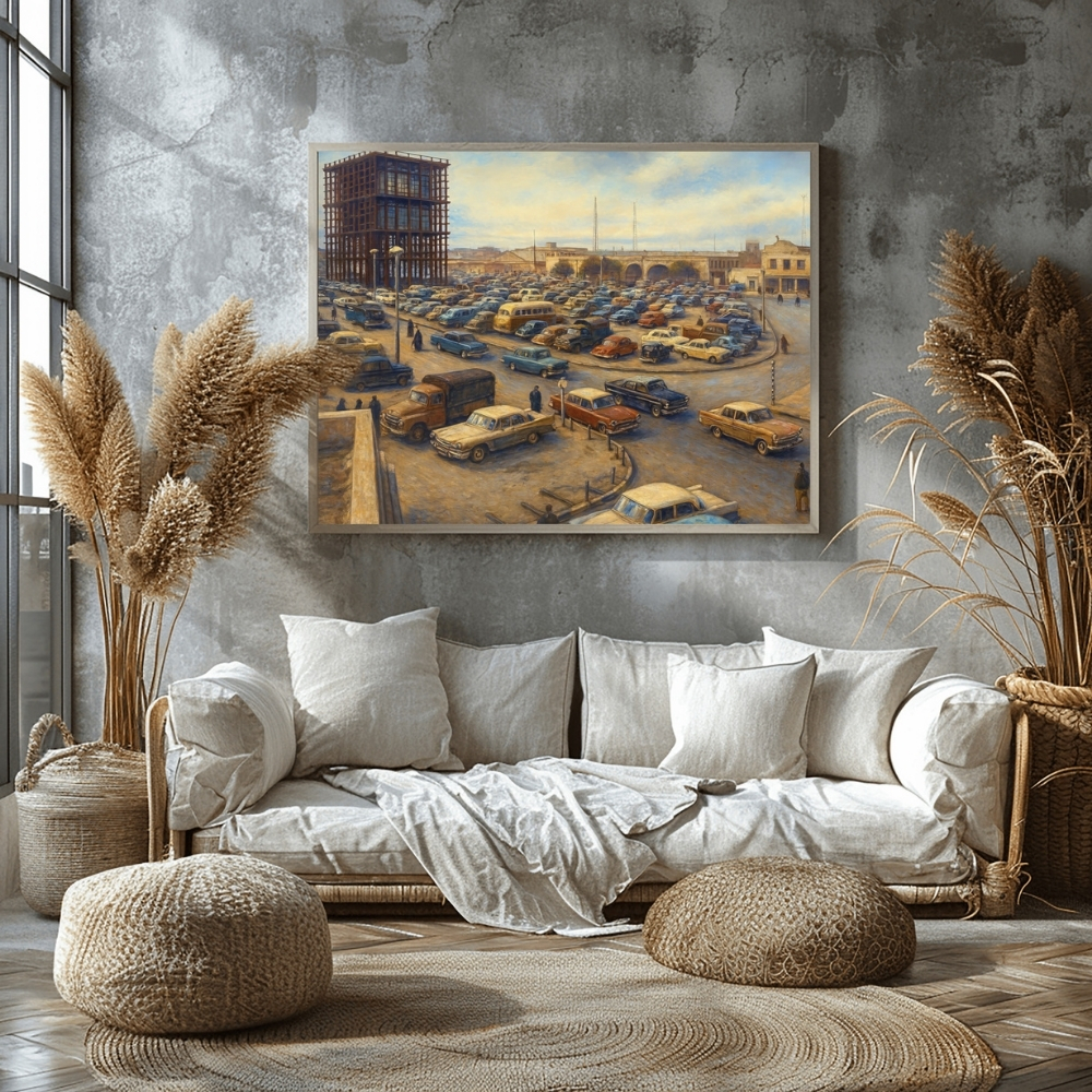 لوحة فنية رقمية قابلة للطباعة (JPG ‎90×60 cm) • توثيق بصري لمشهد حضري نابض في Kuwait City خلال ستينيات القرن الماضي، يُظهر كثافة السيارات وحركة الناس في منطقة تُعد من مراكز النشاط التجاري والإداري، بأسلوب urban heritage art يعكس التحول العمراني المبكر. • تُبرز اللوحة تفاصيل السيارات الكلاسيكية وتخطيط الطرق المفتوحة، مع حضور مبانٍ قيد التطوير تمثل مرحلة modernization era وبدايات البنية التحتية الحديثة في الكويت. • العمل مستوحى من الأرشيفات العامة والمراجع البصرية التاريخية، مع معالجة فنية بأسلوب digital restoration يوازن بين التوثيق والطرح التشكيلي. • تحتوي اللوحة على لمسات إحياء رقمي طفيفة وضربات فرشاة فنية قد تؤدي إلى اختلافات بسيطة في بعض تفاصيل السيارات أو الوجوه والعناصر البعيدة، وهو جزء مقصود من الأسلوب الفني، مع الحفاظ على روح المشهد وموثوقية الإحساس الزمني. • مناسبة للعرض في المكاتب، المجالس، المساحات الثقافية، ومحبي Middle East urban history، ويمكن طباعتها بالمقاسات: 90×60 – 70×50 – 60×40 – 45×30 سم + A1–A4 كعمل vintage city wall art. تنبيه: هذا منتج رقمي فقط – Digital product only، لا يتم شحن أي نسخة مادية.