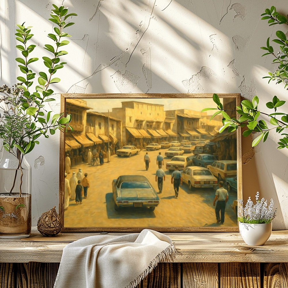 لوحة فنية رقمية عالية الجودة قابلة للطباعة (JPG 90×60 cm) تُجسّد مشهدًا حيًا من أحد أسواق الدوحة القديمة بأسلوب digital realistic restoration art مستوحى من الأرشيفات العامة، حيث تتقاطع حركة الناس مع صفوف المتاجر التقليدية في أجواء تنبض بأصالة الحياة القطرية. • عمل فني مستلهم من الصور والوثائق الأرشيفية التي وثّقت أسواق الدوحة في مراحلها المبكرة، أُعيد تخيّله بأسلوب realistic digital painting يعكس تفاصيل الواجهات الطينية والمشربيات الخشبية والمظلات القماشية الممتدة على طول الشارع. • تصطف السيارات الكلاسيكية على جانبي الطريق في مشهد يوثق مرحلة انتقالية من تاريخ المدينة، حيث تتجاور البساطة التقليدية مع ملامح الحداثة الأولى. • تتوزع الشخصيات في حركة يومية طبيعية؛ رجال بملابسهم التقليدية، متسوقون، وأصحاب محال، في تكوين إنساني يبرز روح السوق الشعبي ودفء العلاقات الاجتماعية. • الضوء الذهبي المنعكس على الأرضيات الرملية يمنح اللوحة طابعًا حميميًا، ويعزز الإحساس بالحنين إلى زمن كانت فيه الأسواق قلب الحياة في Doha heritage architecture. تم تنفيذ هذا العمل باستخدام تقنيات الإحياء والترميم الرقمي المعتمد على الذكاء الاصطناعي، وقد تظهر لمسات فنية طفيفة أو اختلافات بسيطة في بعض التفاصيل مثل ملامح الأشخاص، انتظام السيارات، أو تكرار عناصر الواجهات. هذه السمات ناتجة عن إعادة البناء البصري الذكي وتندرج ضمن أسلوب digital restoration painting، وهي لا تؤثر على الجوهر التاريخي أو صدقية المشهد، بل تضيف طابعًا فنيًا يشبه ضربات الفرشاة الرقمية، مما يعزز الإحساس بالحيوية ويمنح اللوحة عمقًا بصريًا مع الحفاظ الكامل على روح السوق القديم وأصالته. • مثالية لتزيين المكاتب، المجالس، الديوانيات، المنازل، والمعارض الفنية التي تحتفي بالتراث القطري والحياة الشعبية القديمة. • متوفرة بمقاسات متعددة: 90×60، 70×50، 60×40، 45×30 بالإضافة إلى A1–A4 لتناسب مختلف المساحات الداخلية. • يمكن طباعتها بمقاسات أكبر عند الطلب، مع انخفاض طفيف جدًا في الجودة غير ملحوظ بصريًا عند العرض الجداري. تنبيه / Note هذا المنتج رقمي فقط، ستستلم ملفًا رقميًا عالي الجودة، ولن يتم شحن أي منتج ملموس. Digital product only – no physical item will be shipped.