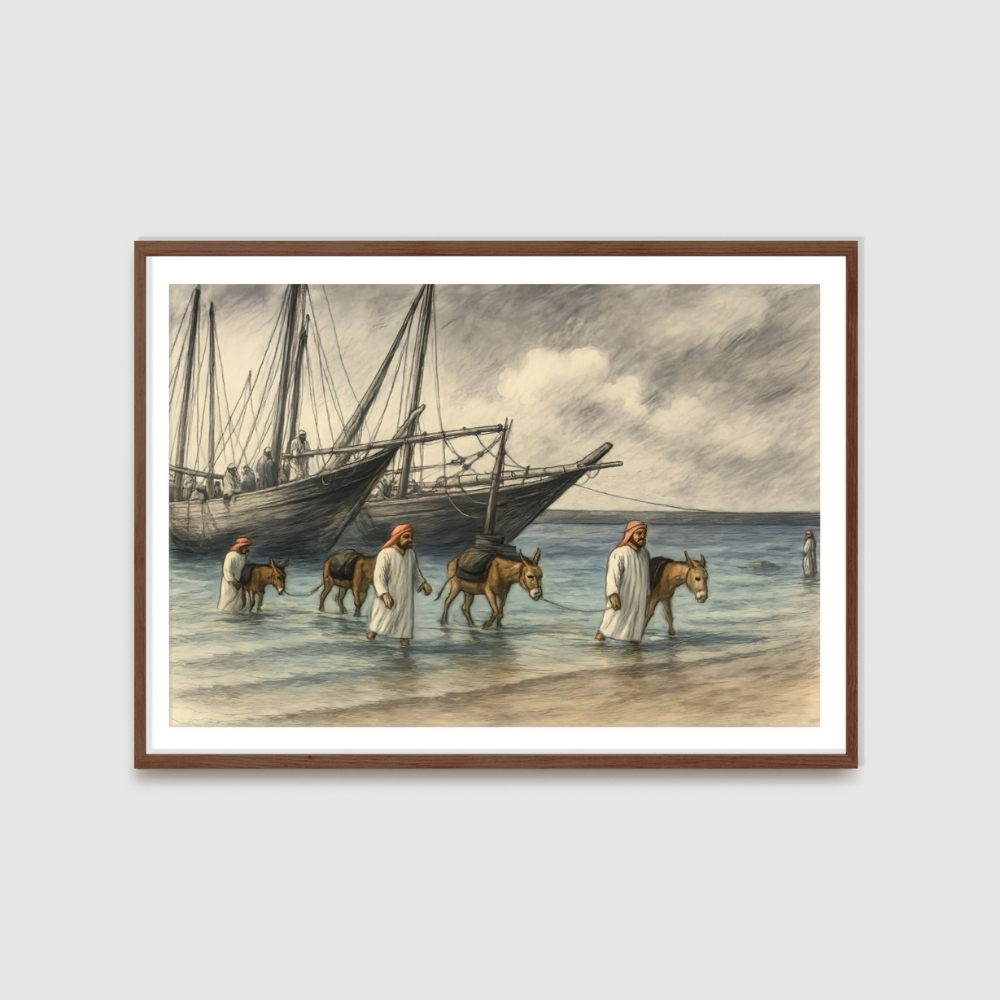 لوحة فنية رقمية قابلة للطباعة (JPG ‎90×60 cm) تُجسّد مشهدًا يوميًا من الحياة الساحلية في الكويت القديمة، حيث يظهر الرجال وهم يقودون الدواب عبر المياه الضحلة لنقل المؤن والبضائع من السفن الشراعية إلى البر، في صورة نابضة بروح traditional Gulf trade وearly coastal logistics. • تعكس اللوحة العلاقة العضوية بين البحر والبر، وتوثّق لحظة انتقال البضائع من سفن wooden dhows إلى اليابسة، في مشهد يعكس بساطة الوسائل وقوة الاعتماد على الإنسان والحيوان ضمن Kuwaiti seafaring heritage. • العمل مستوحى من الأرشيفات العامة والمشاهد التاريخية للموانئ الخليجية، ومُنفّذ بأسلوب historical digital painting يدمج الرسم اليدوي مع المعالجة الرقمية لإحياء تفاصيل الحياة البحرية والتجارية. • تحتوي اللوحة على لمسات إحياء رقمي طفيفة وضربات فرشاة فنية قد تُظهر اختلافات بسيطة أو تشوّهات محدودة في بعض التفاصيل البشرية أو الحيوانية، وهو جزء مقصود من الأسلوب الفني، مع الحفاظ على روح المشهد، مصداقية السياق الزمني، والهوية التاريخية العامة. • مناسبة للعرض في المجالس، المكاتب، المتاحف، والمساحات الثقافية، وقابلة للطباعة بمقاسات متعددة (90×60، 70×50، 60×40، 45×30 + A1–A4)، وتلائم عشّاق Kuwait heritage wall art, maritime history artwork, وGulf coastal life illustration. تنبيه: هذا منتج رقمي فقط – لا يوجد شحن لمنتج مادي. Note: Digital product only – no physical item will be shipped.