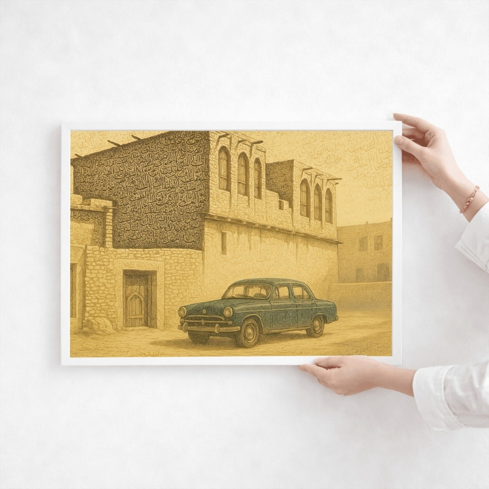 لوحة فنية رقمية عالية الجودة قابلة للطباعة (JPG 90×60 cm) تجسد مشهدًا فنيًا فريدًا من أحياء الدوحة القديمة، بأسلوب digital realistic restoration art مستوحى من الأرشيفات العامة، حيث تمت إعادة تخيّل العمارة القطرية التقليدية بروح تشكيلية أقرب إلى النقش والحفر الفني. • عمل فني مستلهم من صور أرشيفية عامة لبيوت الدوحة الحجرية، أُعيد تقديمه بأسلوب realistic digital painting ممزوج بتأثيرات خطية وزخرفية تمنح الجدران حضورًا بصريًا غنيًا يشبه النقوش القديمة. • تتجلى العمارة القطرية التقليدية في النوافذ المقوّسة، الأبواب الخشبية، والجدران السميكة، بينما تقف السيارة الكلاسيكية في مقدمة المشهد كشاهد على مرحلة تاريخية انتقالية بين البساطة التراثية وبدايات الحداثة. • يغلب على العمل الطابع اللوني الأحادي المائل إلى السيبيا، ما يعزز إحساس الزمن العتيق ويمنح اللوحة بعدًا سرديًا يوحي بأن الجدران نفسها تحفظ الحكايات. فقرة الإحياء الرقمي (Digital Revival Transparency) تم تنفيذ هذا العمل عبر تقنيات الذكاء الاصطناعي والترميم الرقمي، مع الحفاظ على أصالة الروح التاريخية للمشهد. قد تظهر بعض اللمسات الفنية الطفيفة الناتجة عن الإحياء الرقمي، مثل تباينات دقيقة في الملامح أو تفاصيل زخرفية متداخلة أو تأثيرات فرشاة رقمية واضحة ضمن الأسطح، وهي سمات طبيعية في أعمال restoration art digital painting. هذه الفروقات لا تؤثر على صدقية المشهد أو قيمته التراثية، بل تعكس أسلوب المعالجة الفنية الرقمية وتمنح اللوحة طابعًا إبداعيًا معاصرًا بشفافية ومصداقية تامة. • مثالية لتزيين المجالس، الديوانيات، المكاتب، المنازل، وصالات العرض الفنية، حيث تضيف طابعًا ثقافيًا عميقًا يستحضر ذاكرة الدوحة القديمة بروح فنية مميزة. • متوفرة للطباعة بالمقاسات التالية: 90×60، 70×50، 60×40، 45×30 بالإضافة إلى A1–A4 لتناسب مختلف المساحات. كما يمكن طباعتها بمقاسات أكبر عند الطلب مع انخفاض طفيف جدًا في الجودة غير ملحوظ غالبًا عند العرض الجداري. تنبيه / Note تنبيه: هذا المنتج رقمي فقط، ستستلم ملفًا رقميًا عالي الجودة ولن يتم شحن أي منتج ملموس. Note: This is a digital product only. You will receive a high-resolution digital file. No physical item will be shipped.